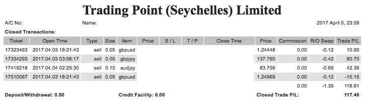 4月5日は前日より持ち越しのポジションを手動で決済。$117.46で終了しました。新たにポジションを複数持っています。