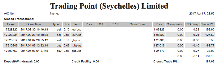 4月7日は雇用統計でしたが、保有ポジションのいくつかはストップを切り下げていたのでそのままトレード。gbpは思惑通りにはいかず、eurusdは利確位置(フィボナッチ)で決済となりました。$187.02で終了です。